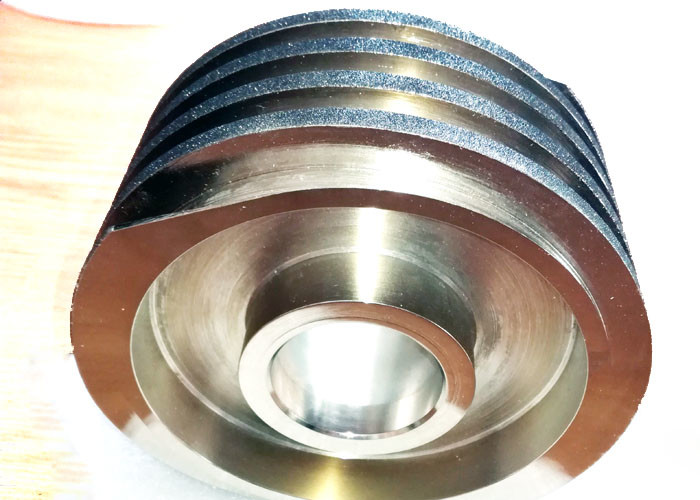 Die für das Schleifen von Küchenmesser verwendeten, mit Elektrofolie beschichteten CBN-Schleifräder sind Ø165,1 mm groß und spiralförmig, so dass sie sich in einem festen Winkel von 30° überlappen.