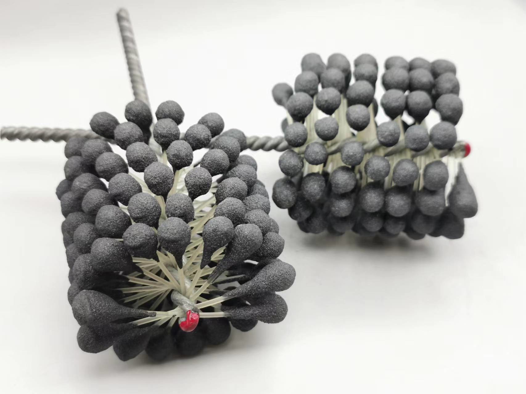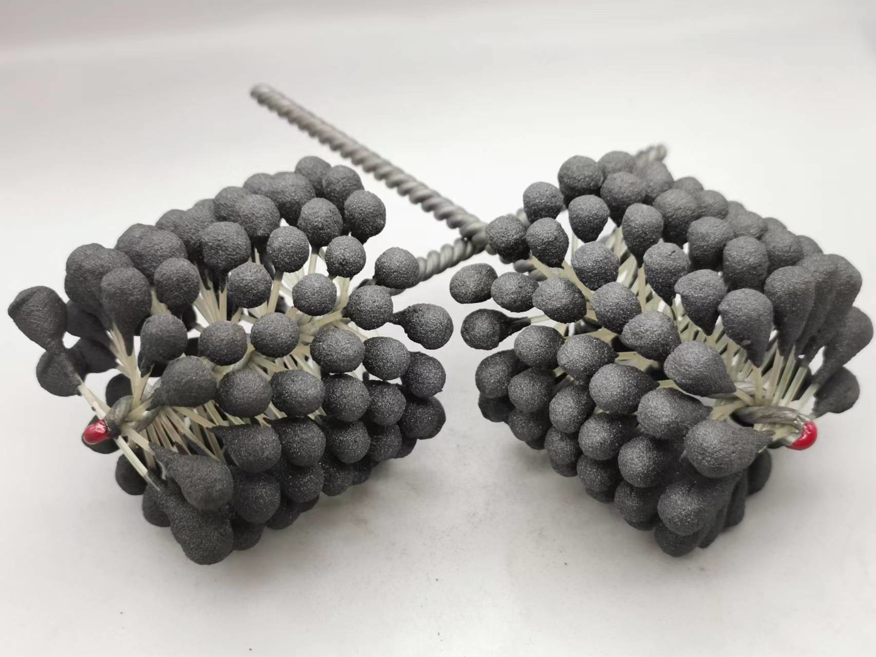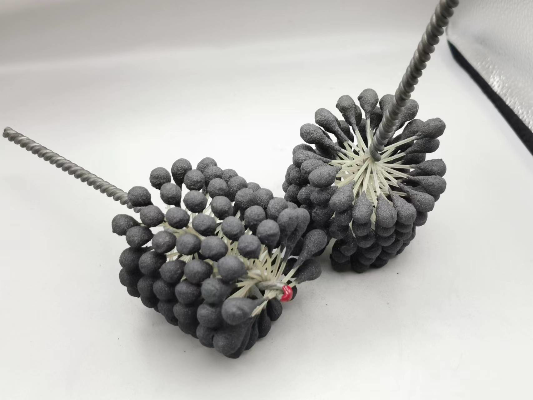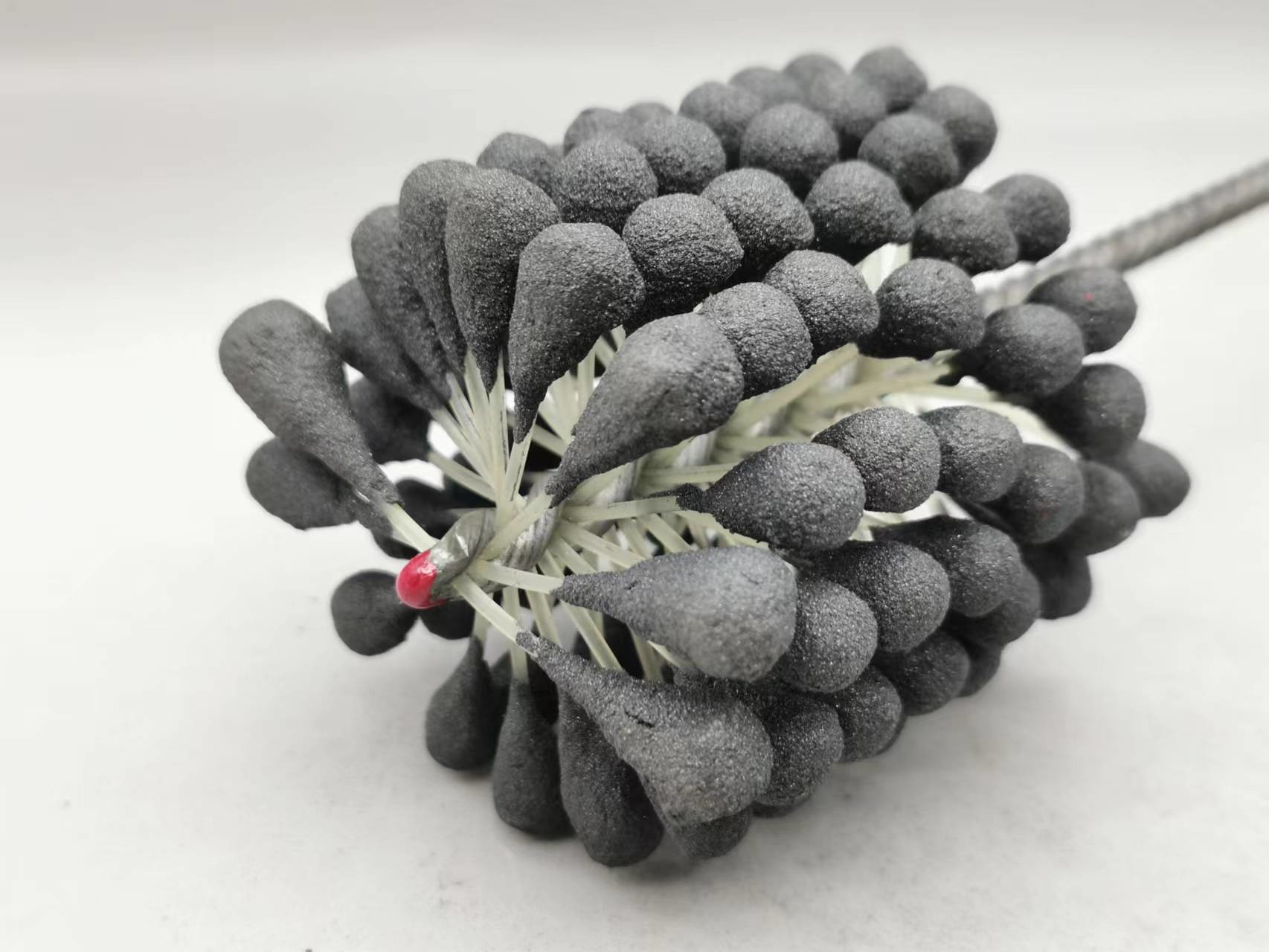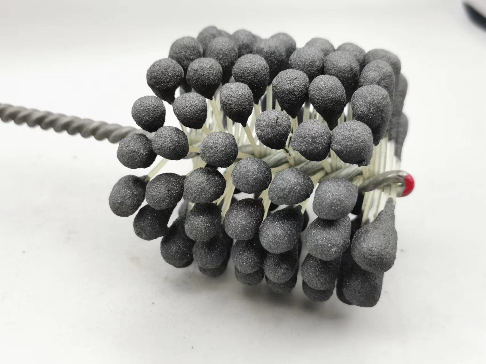 1. Dieser flexible Zylinderschleifstein des Produktes ist eine elastische, flexible abziehende Bürste mit Silikonkarbidscheuermitteln für Gebrauch auf Flussstahl, ein Edelstahl und ein Roheisen. Die Bürste liefert weichen Schneideeingriff und entfernt Grate von quer-gebohrten Löchern. Einzelradaufhängung stellt selbstzentrierendes, selbstausrichtendes zur Bohrung und selbstkompensierendes für Abnutzung sicher.
