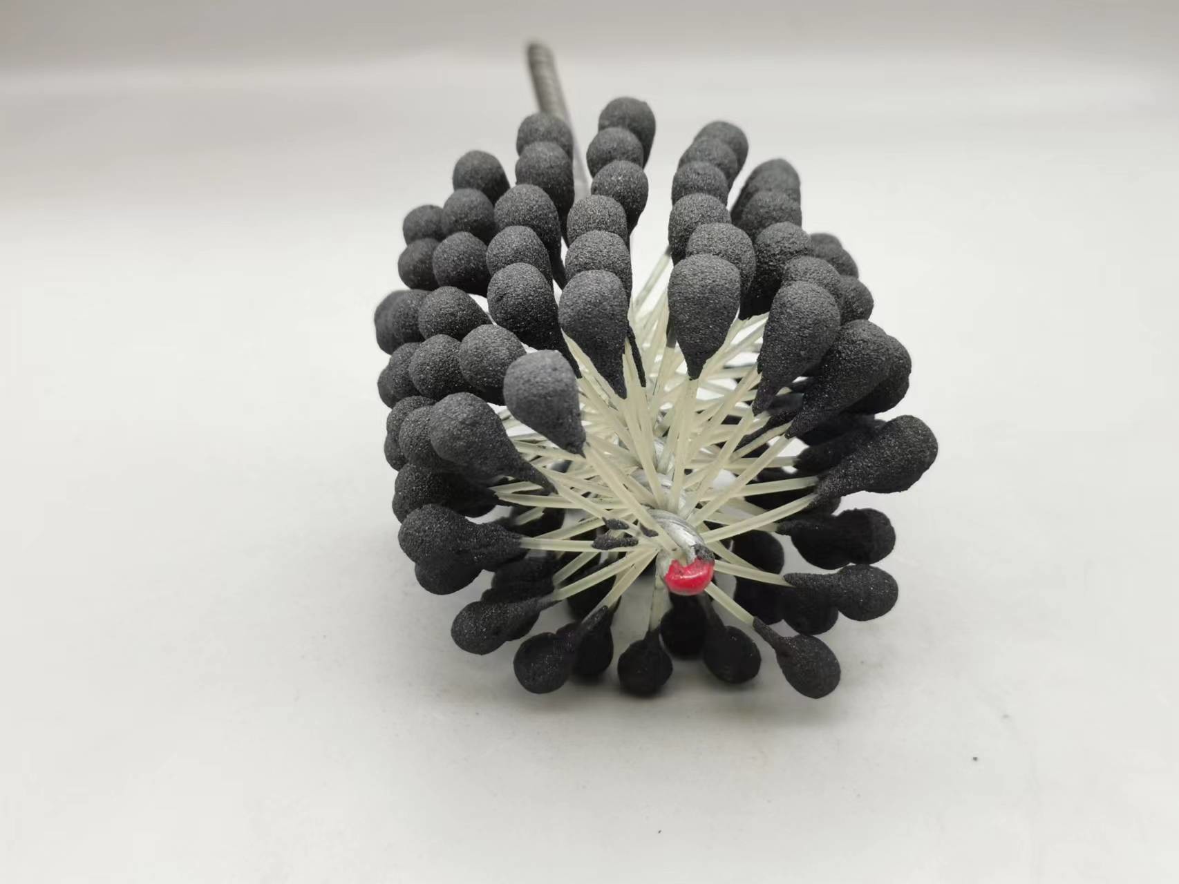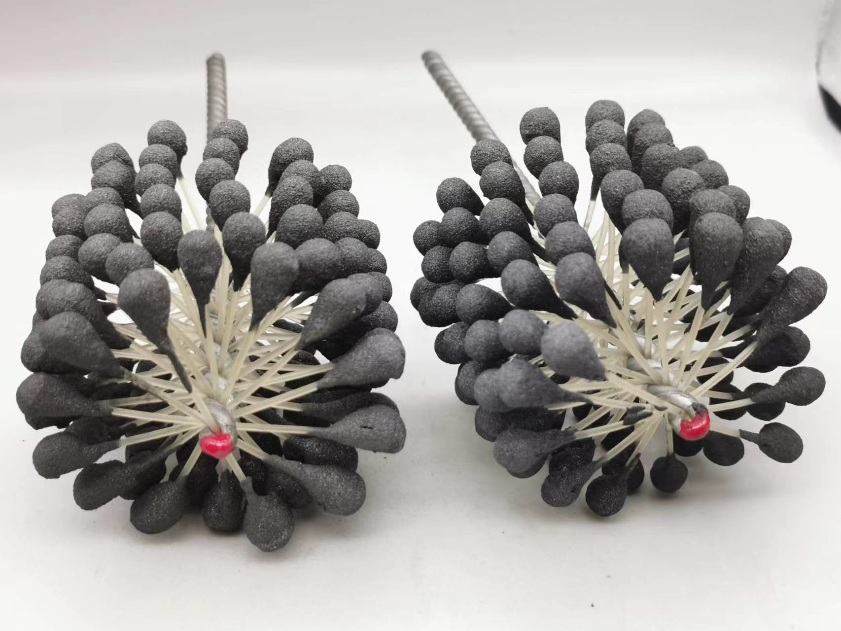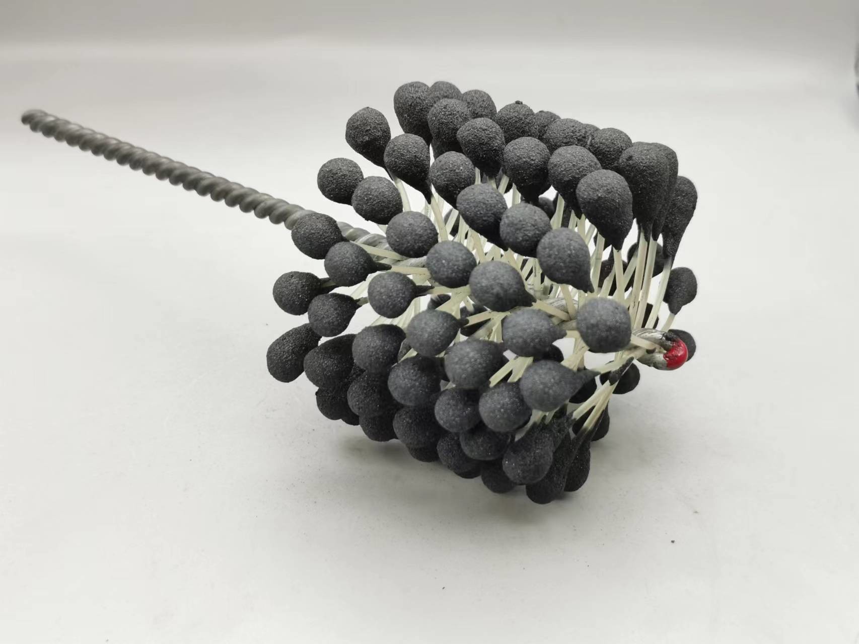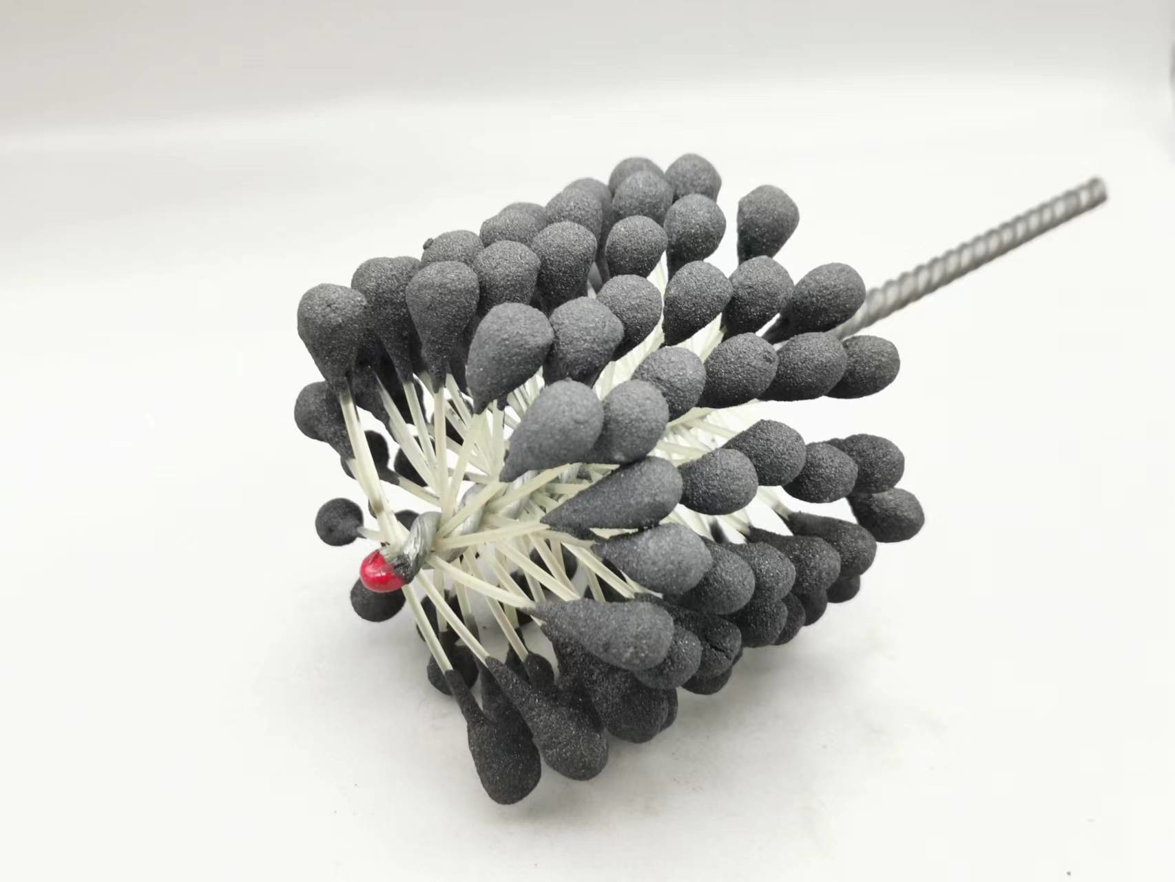1. Dieser flexible Zylinderschleifstein des Produktes ist eine elastische, flexible abziehende Bürste mit Silikonkarbidscheuermitteln für Gebrauch auf Flussstahl, ein Edelstahl und ein Roheisen. Die Bürste liefert weichen Schneideeingriff und entfernt Grate von quer-gebohrten Löchern. Einzelradaufhängung stellt selbstzentrierendes, selbstausrichtendes zur Bohrung und selbstkompensierendes für Abnutzung sicher.